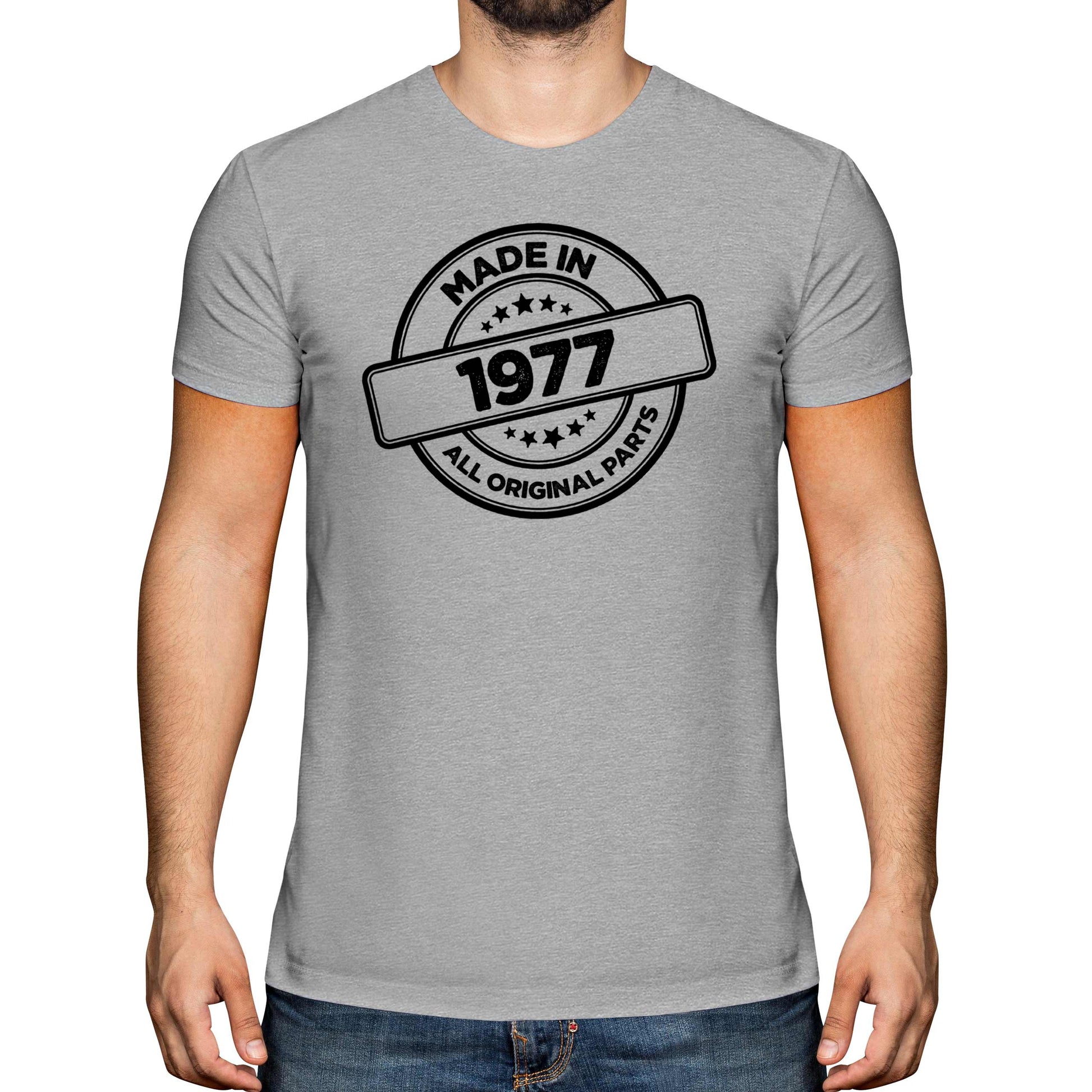 Celebrate a milestone year with this men’s 'Made in 1977' T-Shirt. Featuring a distressed stamp style print and soft cotton comfort, it’s the perfect 48th birthday gift for dads, brothers or friends born in 1977 who appreciate timeless style and classic quality.