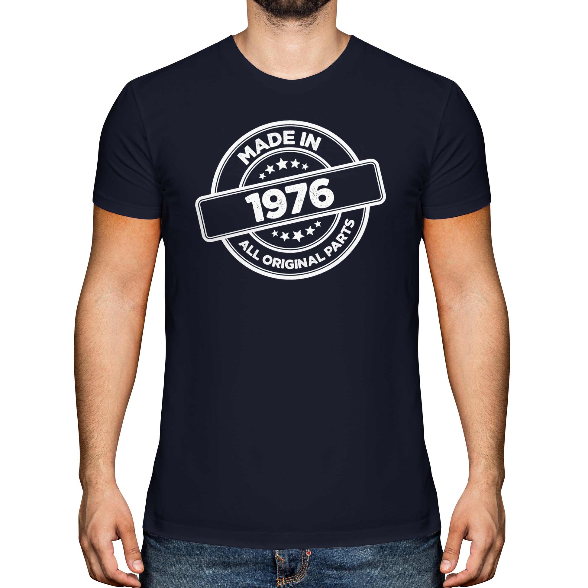 Celebrate a milestone year with this men’s 'Made in 1976' T-Shirt. Featuring a distressed stamp style print and soft cotton comfort, it’s the perfect 49th birthday gift for dads, brothers or friends born in 1976 who appreciate timeless style and classic quality.